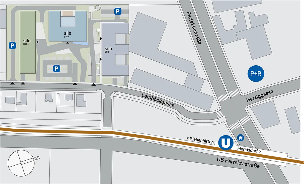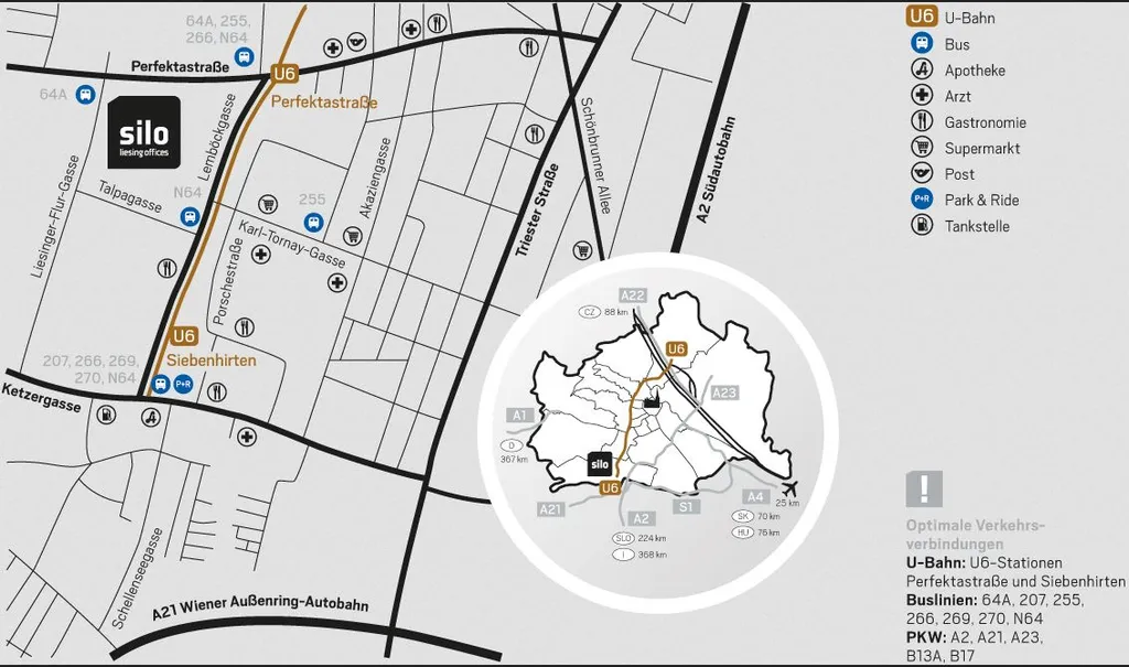 Die Stadtautobahnen und die SCS, Österreichs größtes Shopping- und Entertainmentcenter, sind in wenigen Minuten erreichbar. Zahlreiche Parkmöglichkeiten in den Tiefgaragen machen die Anreise für Mitarbeiter und Gäste attraktiv. Die campusartige Struktur zwischen den drei einzelnen Gebäuden schafft unterschiedlich gestaltete grüne Freiräume. silo office park vereint Business, Urbanität sowie Lebensqualität auf höchstem Niveau und wird als zukunftsweisender Unternehmensstandort neue Maßstäbe im Süden Wiens setzen.